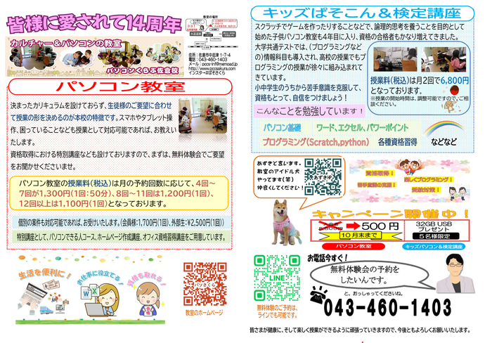 ワードを使ってお絵描きをしたり、スクラッチで簡単なゲームを作ったりすることなどで、パソコンを使って論理的思考を身に着けることを目的にしています。また親御さんから、パソコンを勉強しながら資格もとらせたいというご要望を多くいただいたことから、授業と連動してサーティファイのプログラミング試験(スクラッチ)や、ワード、エクセルの資格試験などの挑戦も可能です。